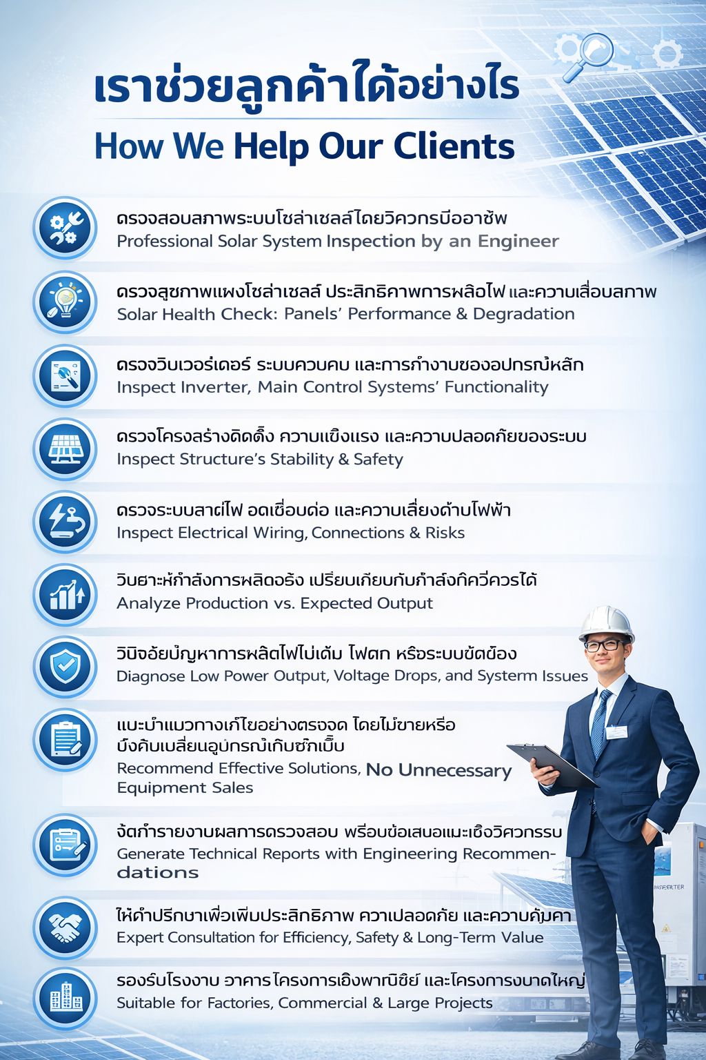 เราให้บริการ ตรวจสอบระบบโซล่าเซลล์ที่มีอยู่แล้ว โดยไม่จำกัดว่าติดตั้งกับบริษัทใด เพื่อช่วยให้เจ้าของโครงการมั่นใจได้ว่า ระบบยังทำงานได้เต็มประสิทธิภาพ ปลอดภัย และคุ้มค่าการลงทุนในระยะยาว